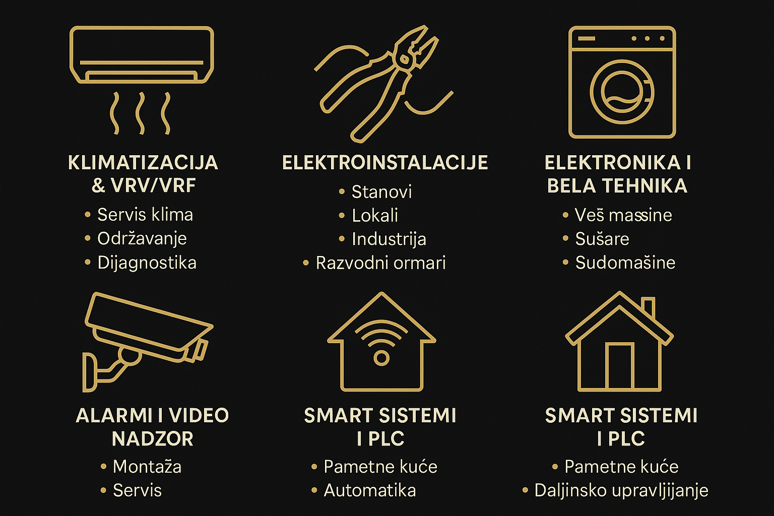 Nudimo elektroinstalacije, pametne kuće, servis bele tehnike, klima sisteme i video nadzor.